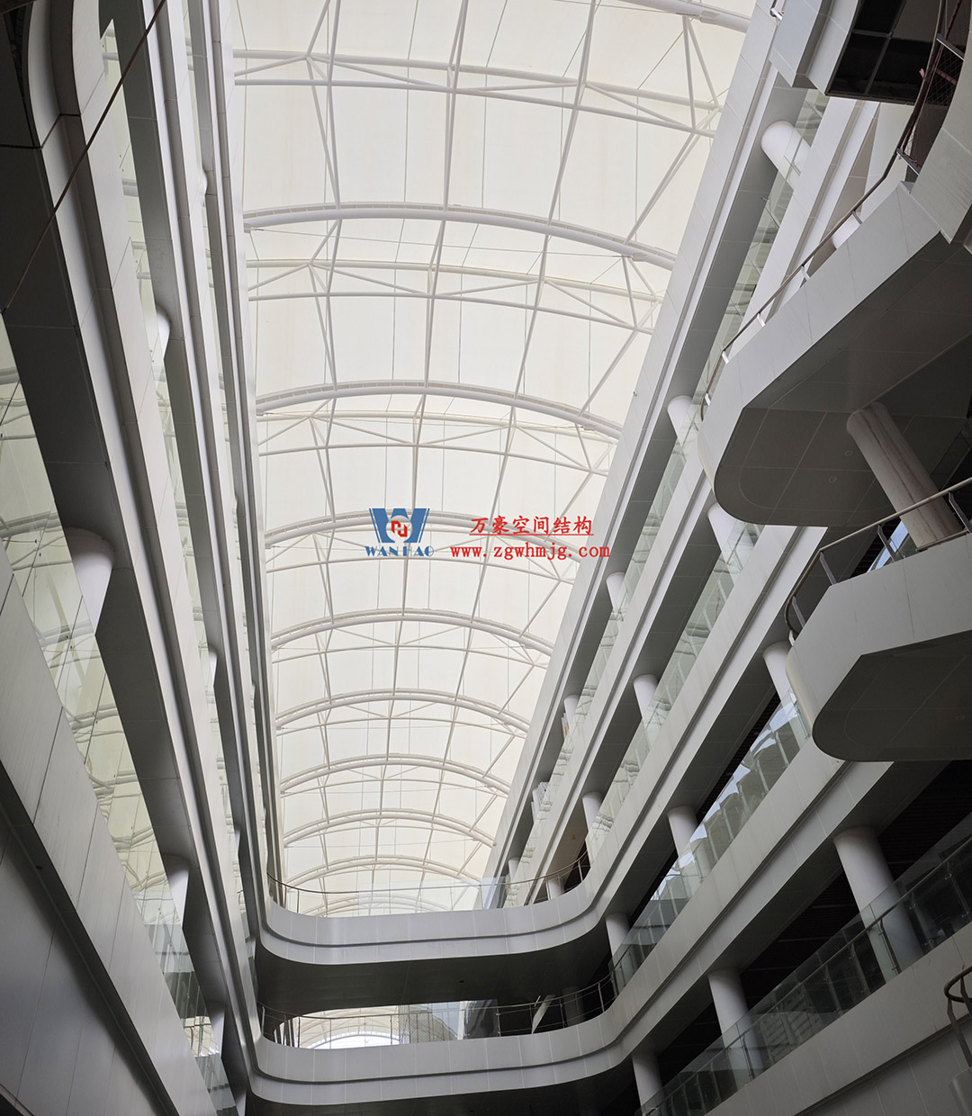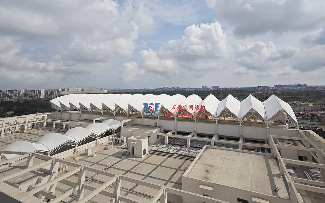 海南醫學院第一附屬醫院江東新院區膜結構工程,該項目用鋼量約360噸,PTFE膜結構展開面積約4500平米。