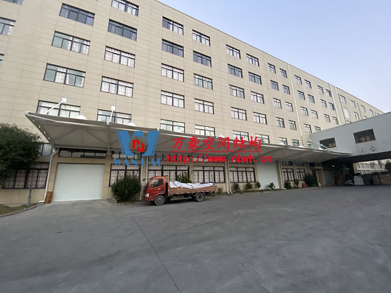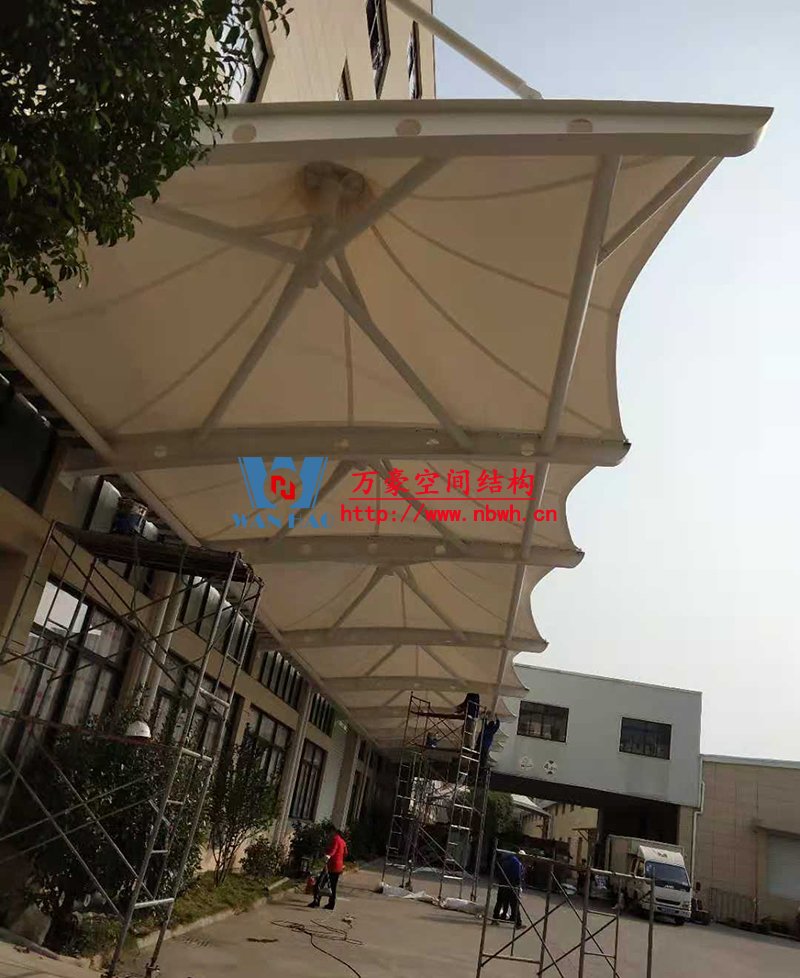 寧波中天家居膜結構雨棚工程位于浙江省寧波市寧海縣,由寧波萬豪空間結構工程有限公司承建。
