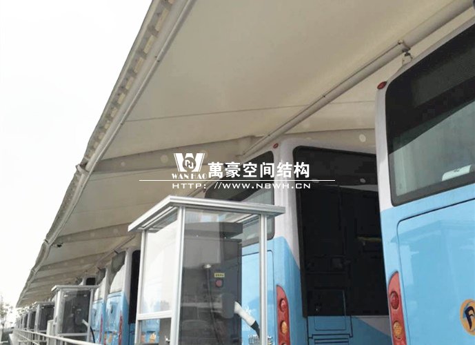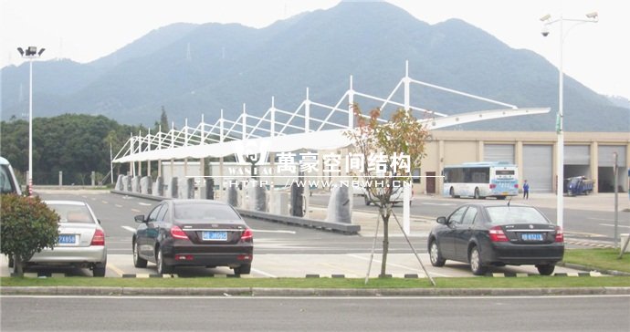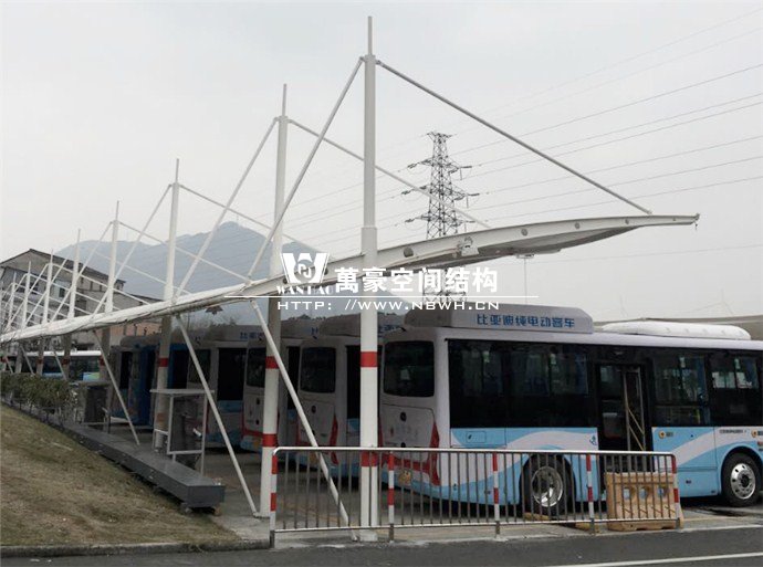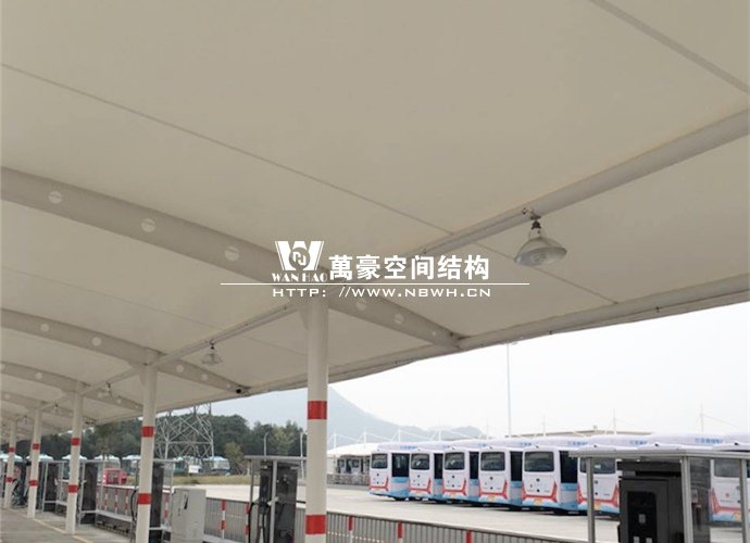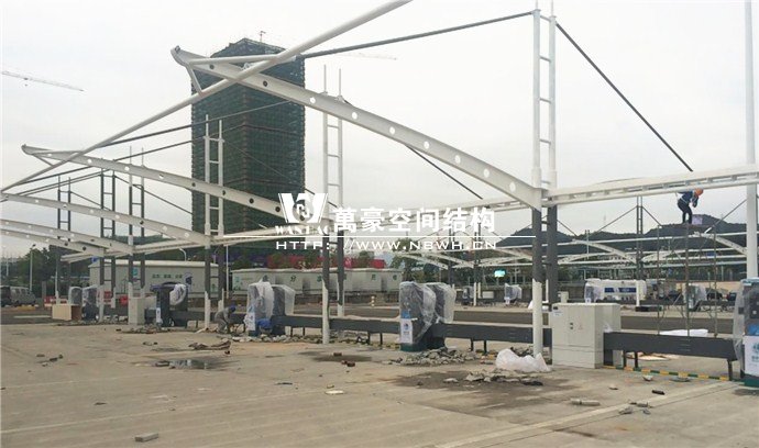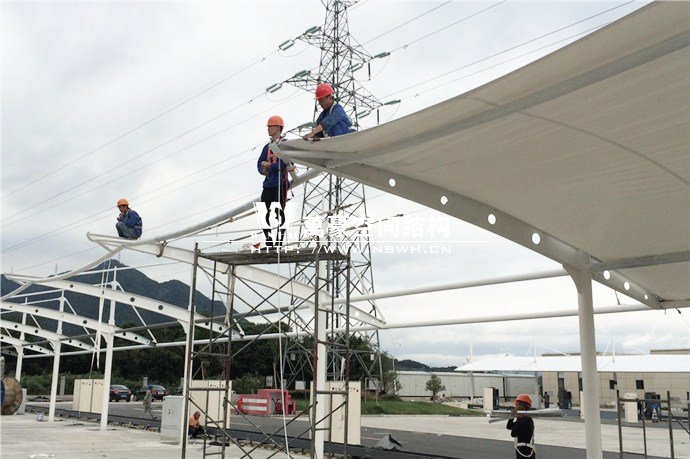 膜結構雨棚施工面積約5138平方;用鋼量約80噸。施工難點在于工期緊。施工時天氣情況差,連續(xù)的陰雨天給鋼構的油漆施工帶來了極大的麻煩并且延誤了工期。雨棚底下還要安裝充電樁,我們還要和充電樁施工班組進行技術對接,規(guī)劃充電樁的安裝位置。由于工期緊,天氣狀況差,我們動用了兩個施工班組加班加點,土建、鋼構交叉施工,最后如期完工。由于每個雨棚長度比較長,施工班組在立好鋼構件之后從中間開始往兩邊安裝膜布,使工作效率有了很大的提高。