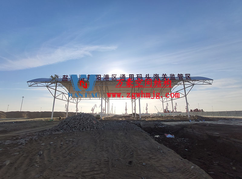 射陽港港區國家一類開放口岸一關兩檢查驗設施項目位于江蘇省鹽城市射陽縣臨港工業園區,用鋼量150噸,膜結構展開面積3000平米,由寧波萬豪空間結構工程有限公司承建。