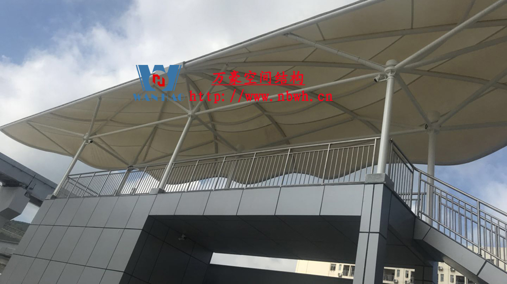 云巴園區(qū)試驗示范線膜結(jié)構(gòu)工程-四角站(原名:坪山一期生產(chǎn)園區(qū)C型線云軌站)位于深圳市坪山區(qū)比亞迪路3009號比亞迪股份有限公司園區(qū)四角大廈西面,該工程用鋼量50噸,膜材展開面積2000平方米,遮蓋材質(zhì)選用最為優(yōu)質(zhì)的ETFE膜材(日本旭硝子),鋼構(gòu)則選用了起拱和各種大小圓弧相融合。