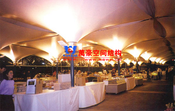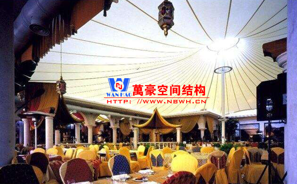 餐廳膜結構建筑主要包括戶外餐廳膜結構和室內餐廳膜結構。戶外餐廳膜結構形式多樣,有的是整個覆蓋在餐廳之上的膜結構,有的是覆蓋某片固定區域做為用餐區的膜結構,還有的采取一桌一頂棚的形式存在,主要功能是遮陽擋雨作用。室內餐廳膜結構建筑主要分為頂棚膜結構和裝飾膜結構兩種,主要起到裝飾作用,增加環境的美感。