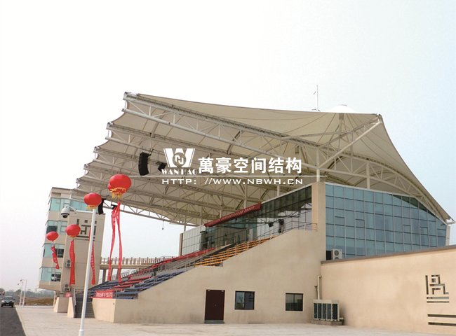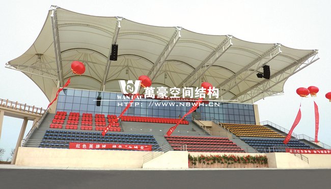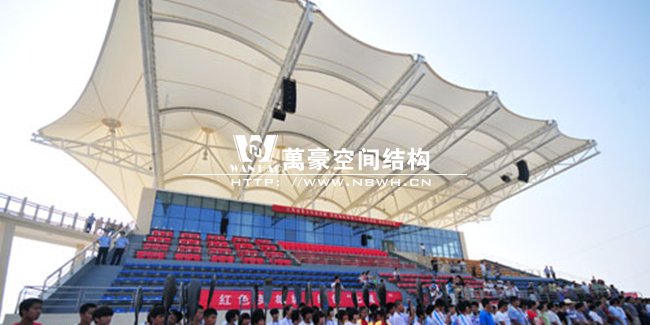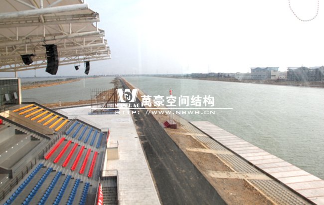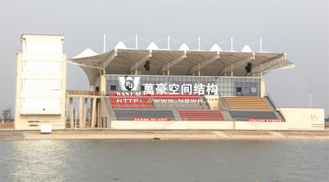 南昌瑤湖國際水上運動中心膜結構看臺整體工程呈骨架式單挑懸臂梁結構,縱向跨度達到20米,總長度約52米,每檔間距為8.5米,充分體了膜結構具有大跨度,易施工的結構特點,同時它的經濟實用性和視覺美觀性也得到了完美的體現。
