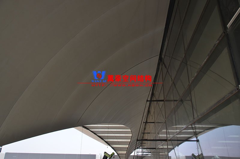 展廳的膜材透光率達(dá)到15%,東大廳和南北塔樓都采用的是魚腹式幕墻,這樣保證了透光效果更好,從外部看也更有設(shè)計感。