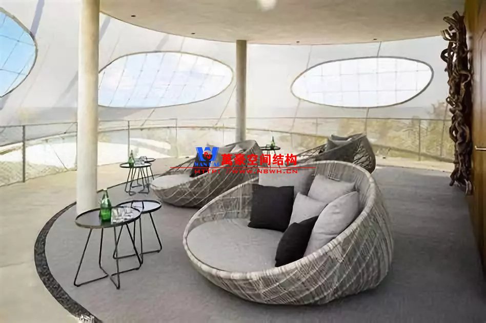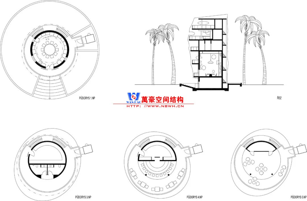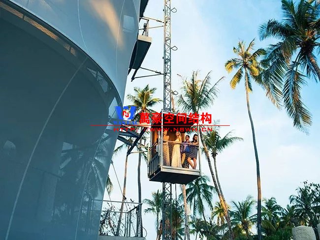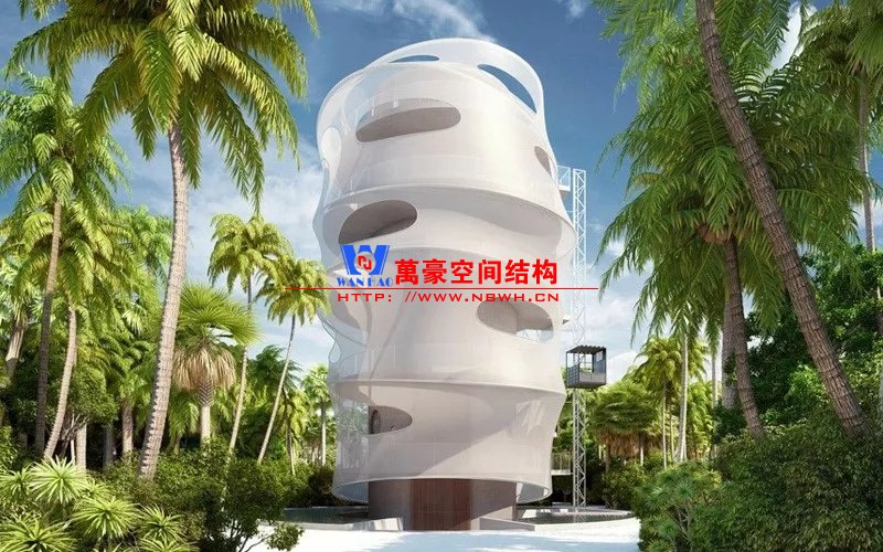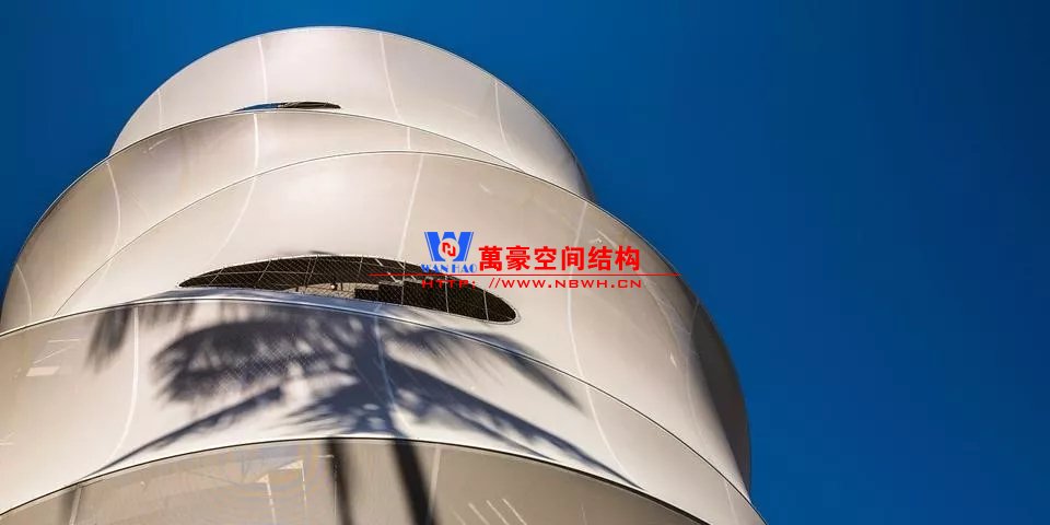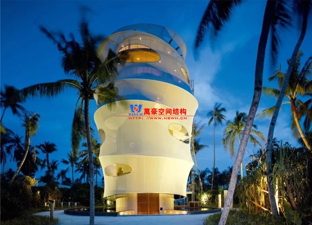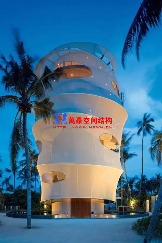 與島上其他傳統(tǒng)的“塔瓦魯”風格建筑不同,由于其高度為23米,并且采用特殊結(jié)構(gòu),目前的結(jié)構(gòu)在島上占主導(dǎo)地位。建筑物的正面使用了鋼筋混凝土整體結(jié)構(gòu),而不是傳統(tǒng)的天然材料。它用作支撐管,由各個預(yù)制臺階制成的控制臺樓梯圍繞該支撐管旋轉(zhuǎn)。外圍的所有元素都被遮蓋在淺灰色半透明的法拉利381網(wǎng)孔膜中,遮陽隔熱,又不影響視覺通透性。