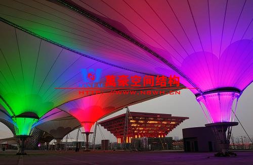 世博軸ptfe索膜結(jié)構(gòu)是迄今為止世界規(guī)模最大的連續(xù)張拉索膜結(jié)構(gòu),膜材選用了一種名為PTFE(聚四氟乙烯)的涂層玻璃纖維,具有不易燃性、防紫外線、抗風(fēng)化、自潔性、高反射性等特點(diǎn),完全可以適應(yīng)上海地區(qū)的臺(tái)風(fēng)氣候。陽(yáng)光谷ptfe索膜結(jié)構(gòu)只有在十級(jí)以上的風(fēng)力,才會(huì)出現(xiàn)明顯的位移,這個(gè)位移也在可以控制的范圍之內(nèi)。陽(yáng)光谷建筑負(fù)責(zé)人驕傲的告訴記者。上海世博會(huì)工程建設(shè)指揮部辦公室的市政項(xiàng)目部總經(jīng)理趙克平透露,張拉膜總面積約77224m2,最大跨度約97米,由31個(gè)外側(cè)桅桿,19個(gè)下拉點(diǎn)以及18個(gè)與陽(yáng)光谷的拉接點(diǎn)通過13種不同功能索張拉而成,膜片數(shù)量69片,其中最大的膜單片面積達(dá)1780m2。