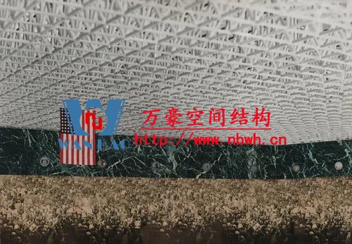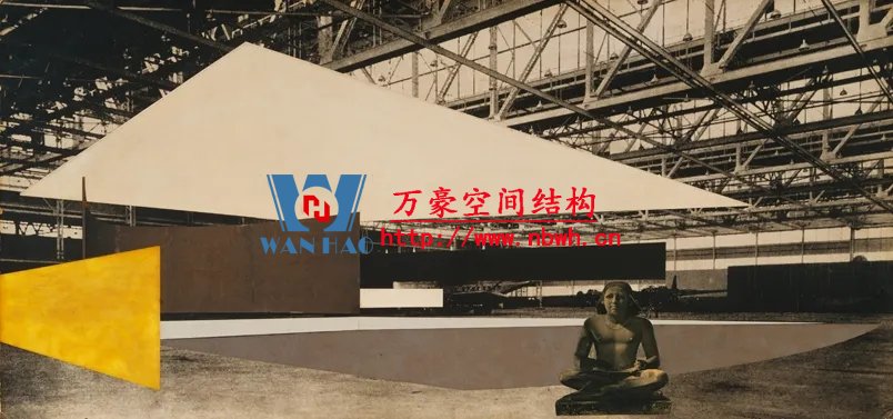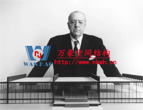 1942年,密斯制作了一個音樂廳的照片拼貼畫,采用阿爾伯特·康于1937年設計的格倫·馬丁飛機組裝大樓的室內做為背景,在其中設置了木材和鋼板制成的靈活的墻和頂棚,疊加上他的基本空間概念。阿爾伯特·康是為亨利·福特和其他底特律汽車工業家服務的建筑師,設計了適應于汽車生產線的大空間廠房。30年代末,美國的鋼鐵技術已經能夠生產更大的斷面,焊接方法開始在建筑中替代鉚接,使節點更為簡潔。這些新技術促成了更大跨度的屋蓋,增加了建筑空間的可能性。1952-1953年,密斯又發展了康拉德·瓦克斯曼為美國空軍機庫所設計的結構,為芝加哥會議中心設計了一個會議大廳,約720英尺見方,屋面采用網架結構,結構高度約30英尺,側面端頭懸挑達60英尺。拼貼畫的室內使用大理石紋理代表大空間內的墻體飾面。密斯引用康和瓦克斯曼的結構做為自己作品的支撐,啟示了一個鋼結構通用大空間的新時代。