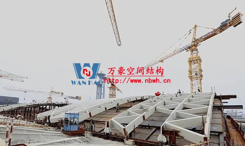 正在滑移施工的鋼屋面網(wǎng)殼用鋼量約2800噸,南北長168米,東西跨度72米,鋼屋蓋網(wǎng)殼面積大,距離地面高度為44米-52米,高空作業(yè)量大,構(gòu)件吊次多達(dá)3000次,吊裝時間約2個月,工期緊,鋼結(jié)構(gòu)焊接精度和質(zhì)量要求極高,屋蓋網(wǎng)殼為索承結(jié)構(gòu),控制變形難度大。