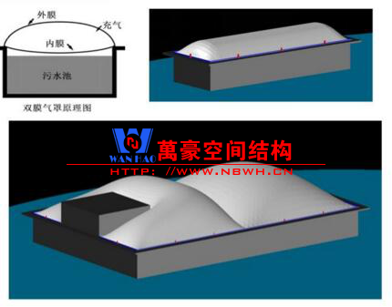 在反吊鋼支撐的基礎上,膜結構企業又開發了另一種污水池封閉技術,就是內外膜氣罩封閉,即雙膜氣罩,這就如污水池上蓋了一個氣囊,它由氣密性極強、撕裂強度極大的膜材料焊接而成,通過四邊與污水池池壁的錨固,形成一個穩定的受力結構,從而將污水池池內惡臭氣體封閉在一個相對較小的空間里,降低除臭風機的抽風空間,降低用電量。這就是污水池膜結構氣罩封閉技術。