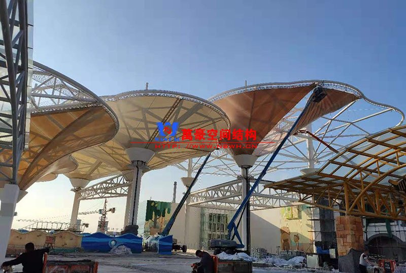 該項目設計思路沿用了上海世博軸的倒傘形狀,其中最大的一個傘形面積達8000平米,工程共計用鋼1500噸,膜結(jié)構(gòu)展開面積3萬平米,是鋼、膜、索結(jié)合真正意義上的大型索膜結(jié)構(gòu)。