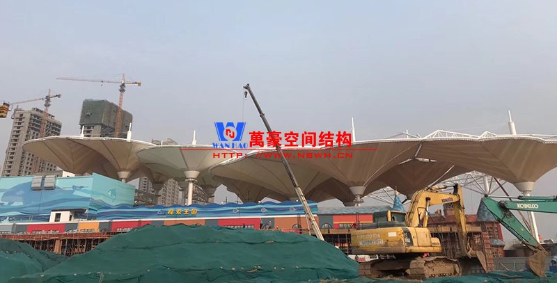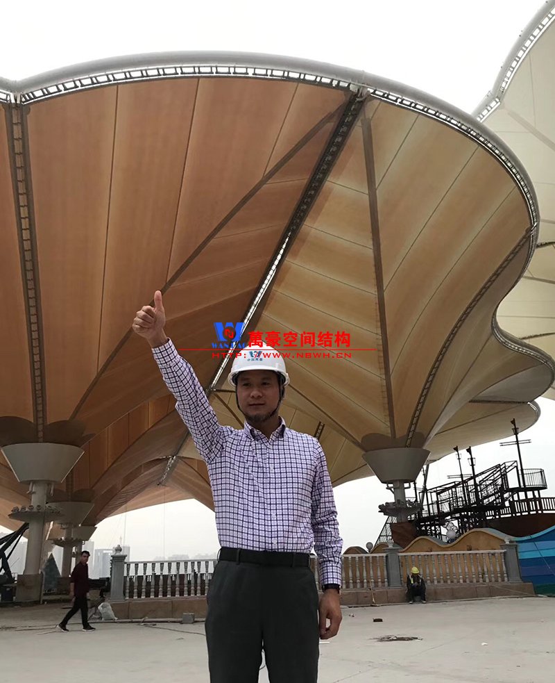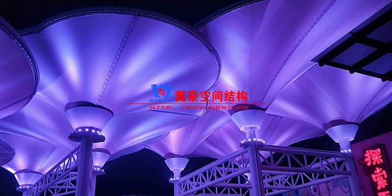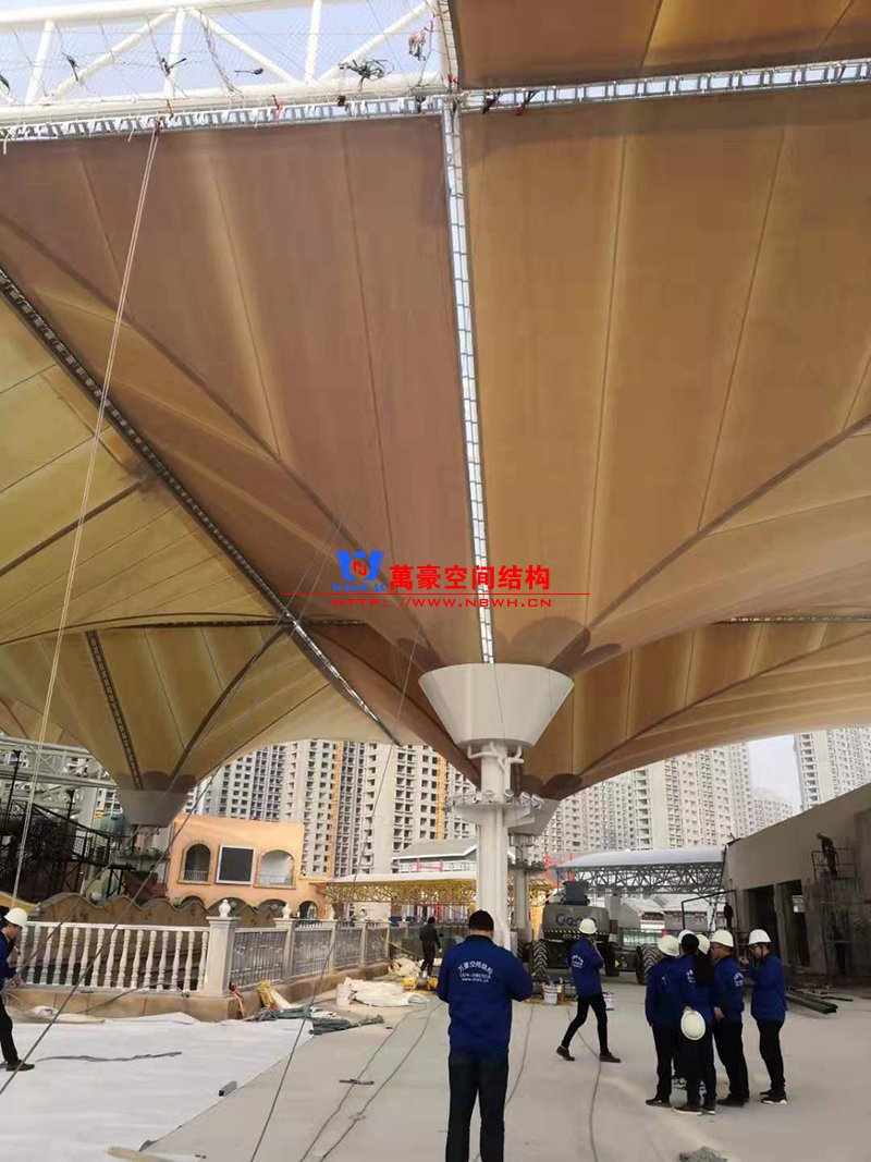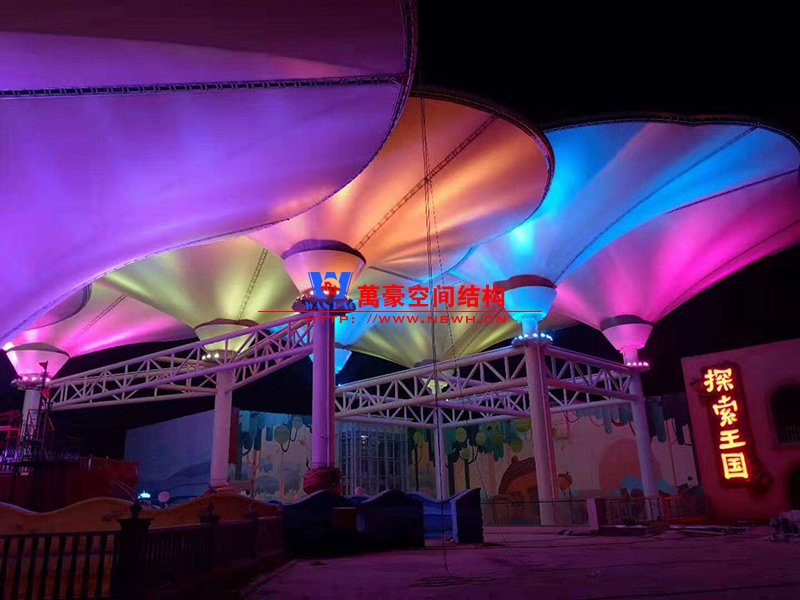 ? 聊城歡樂小鎮七彩云朵項目膜結構工程倒傘型最大單體8千平米,落地立柱最高60米,直徑1.2米,最大懸挑36米,項目創造了國內文旅商業類屋頂倒傘類之最。燈光已經進入安裝調試階段,五彩繽紛的造型在夜幕中綻放更有獨占鰲頭的磅礴氣勢。領導肯定的說該項目在當地10年內再無其他項目超越,自信和自豪并存,膜結構項目得到業主總指揮及相關管理部門的高度評價和認可,極大的鼓舞了現場施工氣氛與斗志,對現場要求再接再厲一氣呵成,爭做經典之作。