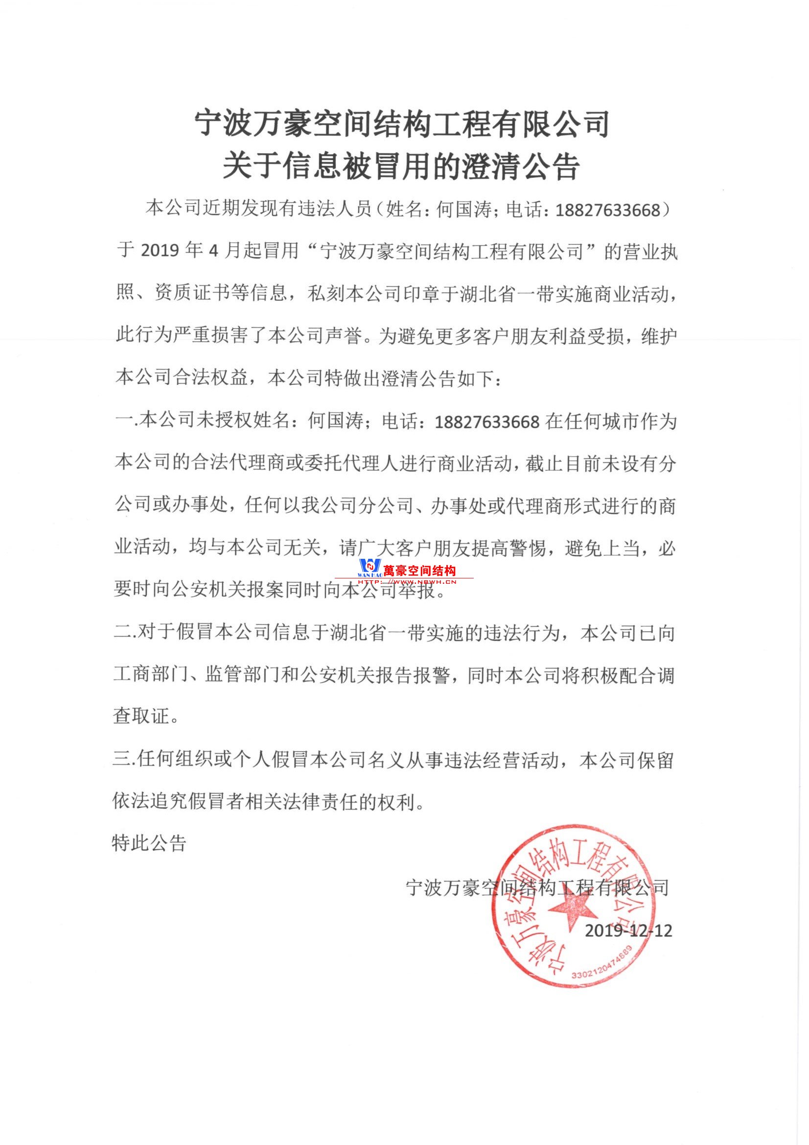 本公司近期發現有違法人員(姓名:何國濤;電話:18827633668)于2019年4月起冒用“寧波萬豪空間結構工程有限公司”的營業執照、資質證書等信息,私刻本公司印章于湖北省一帶實施商業活動,此行為嚴重損害了本公司聲譽。為避免更多客戶朋友利益受損,維護本公司合法權益,本公司特做出澄清公告如下: