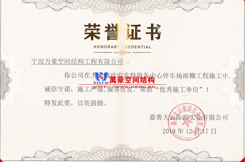 萬豪大云鎮(zhèn)政府黨群服務(wù)中心停車場雨棚工程榮獲優(yōu)秀施工單位獎(jiǎng)!