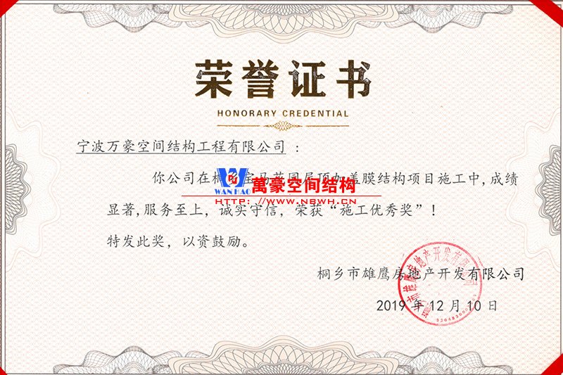 萬豪桐鄉(xiāng)寶馬花園屋頂加蓋膜結(jié)構(gòu)項(xiàng)目榮獲施工優(yōu)秀獎(jiǎng)!