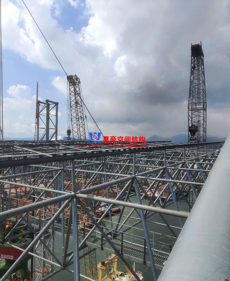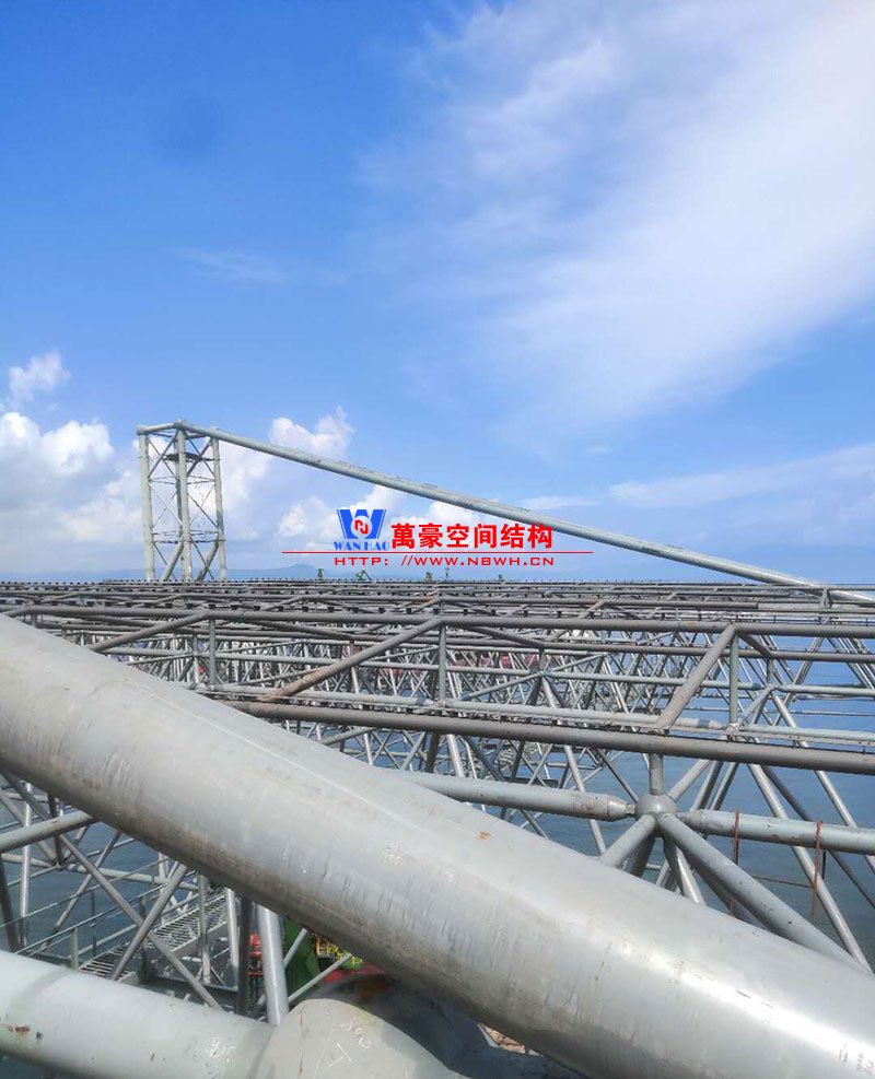 該工程為網(wǎng)架結(jié)構(gòu),高度55米,跨度160米,采用鋼結(jié)構(gòu)地面整體拼裝,分區(qū)域整體起吊的安裝方式,鋼用量總共2000噸,膜結(jié)構(gòu)展開面積30000平米,屋面膜結(jié)構(gòu)工程由寧波萬豪空間結(jié)構(gòu)有限公司承建。