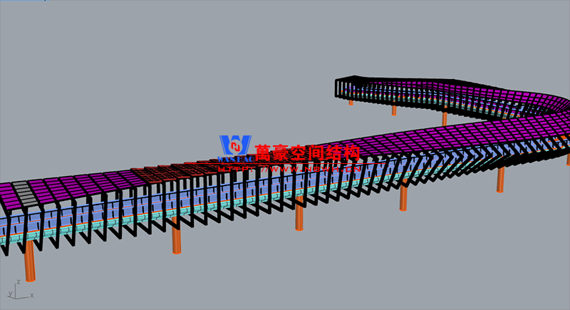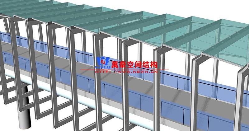 深圳龍崗三館一城項目市政配套工程1號連廊膜結構工程項目為單層ETFE膜結構,共劃分為101個單元,總面積約為2000㎡,由寧波萬豪空間結構工程有限公司承建。膜結構原材采用德國NOWOFOL-300μm鍍點ETFE材料,保證透光率的同時,兼顧防范紫外線。膜結構四周利用鋁合金夾具固定于主鋼結構二次構件上,膜面采用PE鋼索輔助支撐,確保膜面有效承擔相應動荷載。