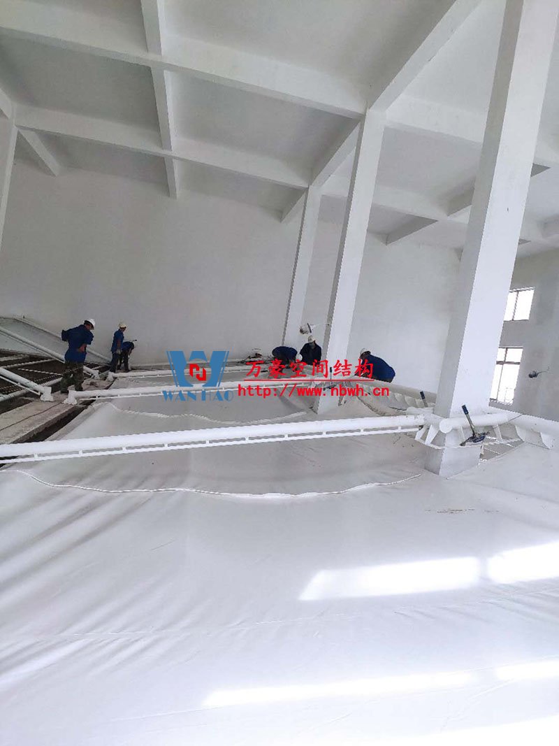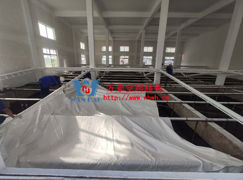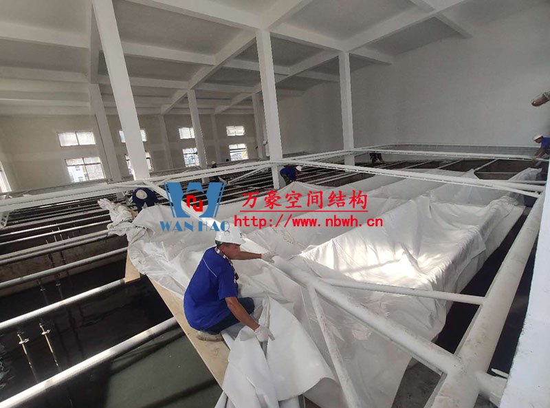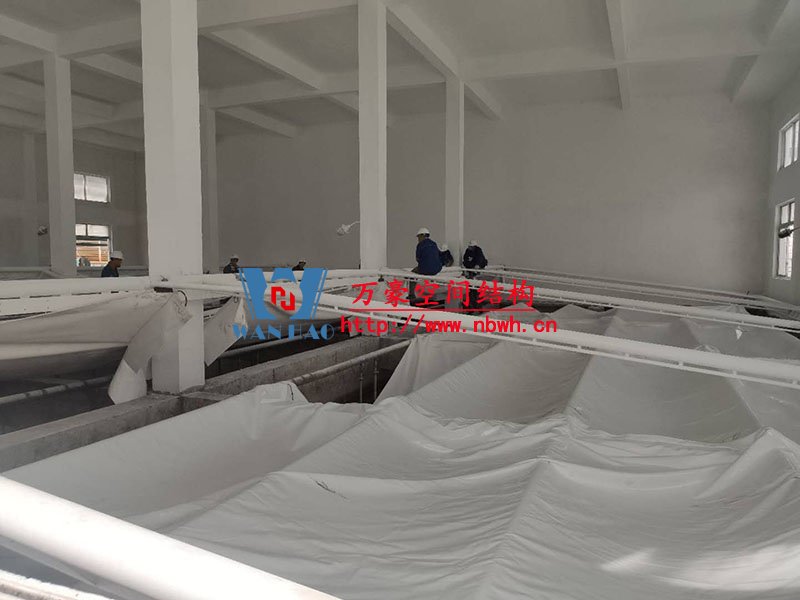 浙江仙琚制藥股份有限公司廢水站室內鋼膜結構項目位于浙江省臺州市仙居縣內,此工程膜結構展開面積2300平米,由寧波萬豪空間結構工程有限公司承建。 項目設計分七個區,目前鋼構油漆施工完成,第一個區膜布安裝中。 期待整個工程的完工,來領略它別致的風采。