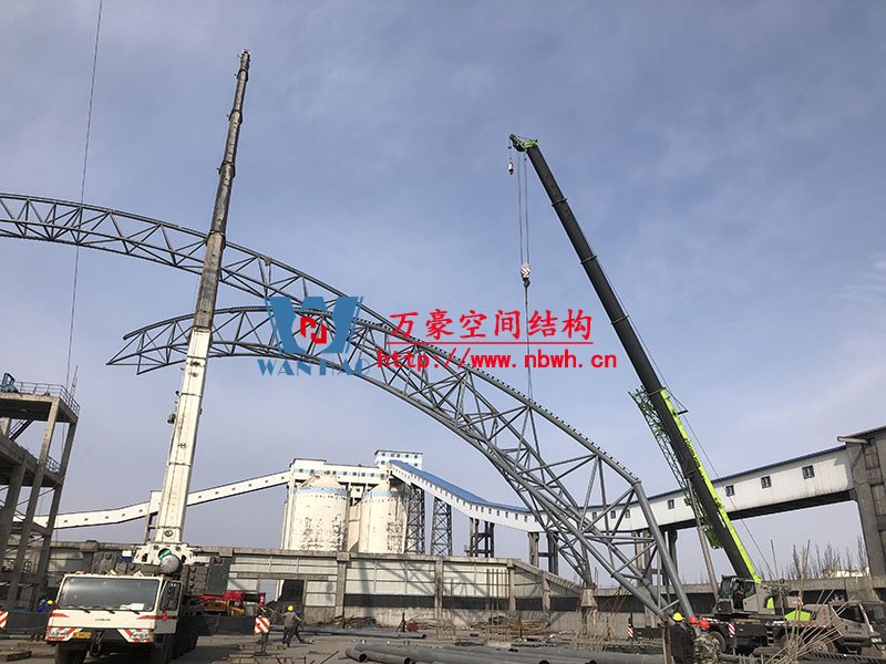內蒙能源長城五礦選煤廠鋼骨架膜棚建設項目位于內蒙古鄂托克前旗上海廟鎮長城五礦選煤廠內。 本項目膜結構罩棚鋼結構高度40米,跨度115米,膜結構展開面積25000平米。 鋼結構主桁架一共6跨,目前已完成2跨。