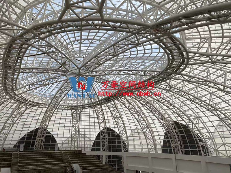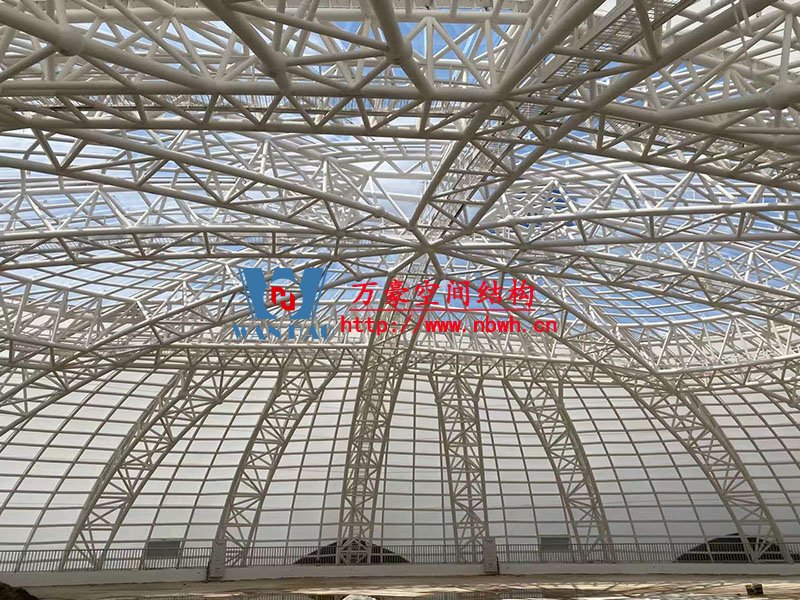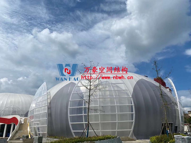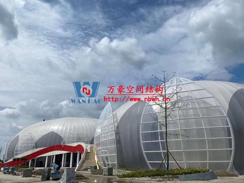 全封閉籃球館和多功能館結構部分采用了部分珩架與單層雙曲面網殼組合,屋面膜選用了不同顏色不同材質組合構成了含苞待放的花朵,項目落成后將為當地體育活動增添活力。