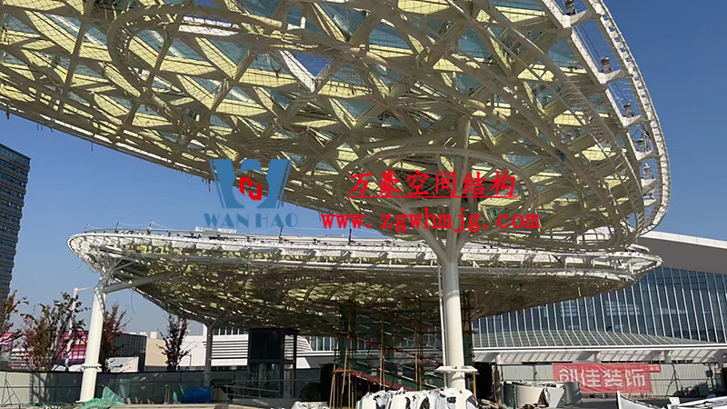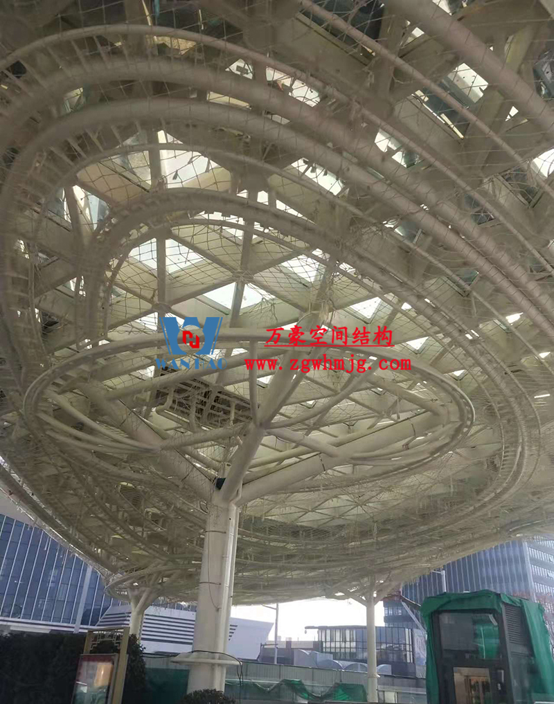 本工程鋼結構為單層雙曲網殼結構體系,平面上為對稱結構,大翅膀長跨約 50m,短跨約 25m,小翅膀長跨約 35m,短跨方向約 15m。建筑頂面為雙曲造型,建筑物最高點標高約17米??傆娩摿?00噸,膜體總面積約7000平方米。