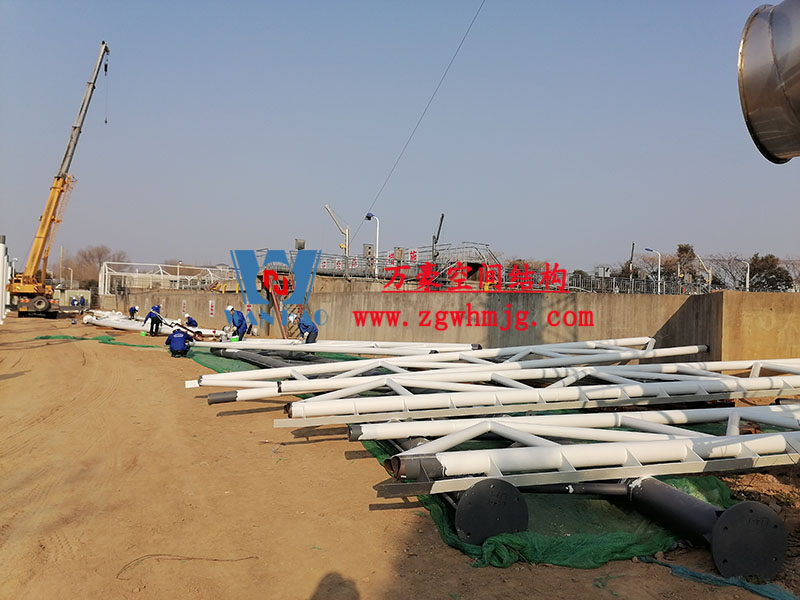 項目采用鋼骨架反吊膜結構,工程內容由混泥土基礎工程、鋼結構工程、反吊膜屋面工程三部分組成,膜結構展開面積12000平米。