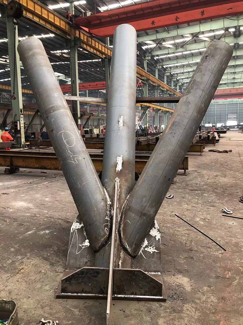 該項目柱腳節點復雜,為避免應力集中,確保結構安全,柱腳三根桿件在工廠組焊成整體進行吊裝,然后和現場拼接桿件對接。