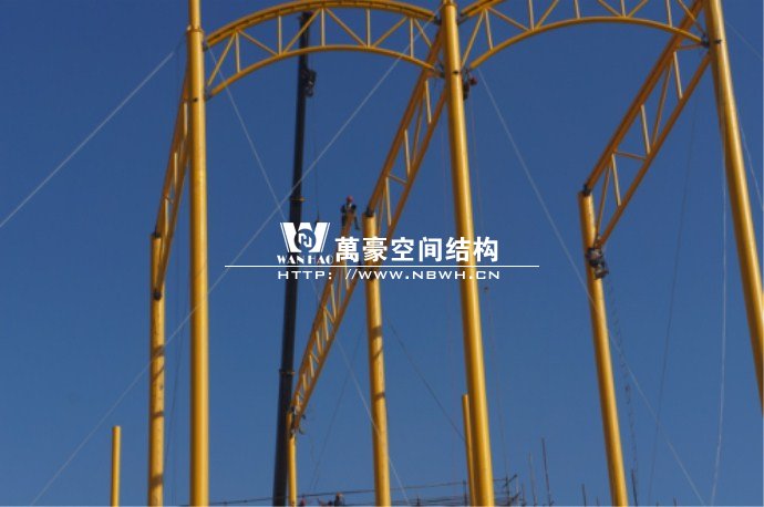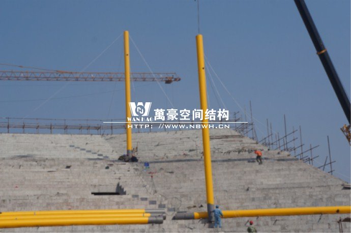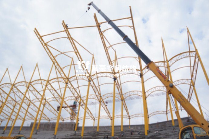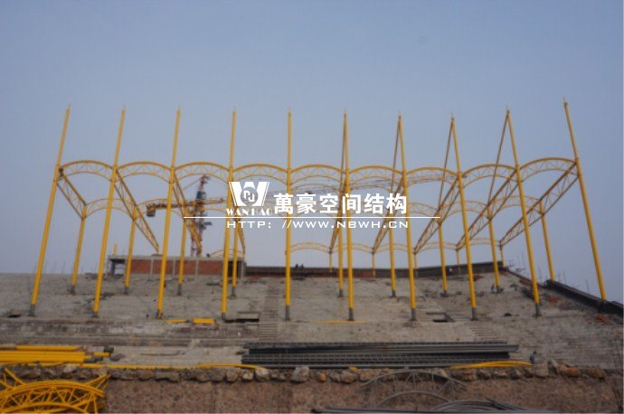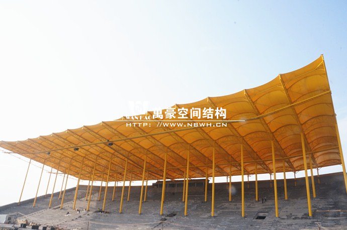 橫店影視城被一圈連綿起伏的山巒包圍著,層疊的遠山宛如水墨畫。圓明新園則位于小鎮西邊的山巒中,芳草萋萋、溪水潺潺!花仙湖膜結構看臺坐落于圓明新園春苑東北角,為骨架支撐式膜結構,建筑面積約為16000㎡,看臺主體結構可分為15個單元,屋面膜結構則由30片膜組成。主體結構劃分為四大部分:鋼柱、主桁架、次桁架和馬道。鋼柱高34.76米,單個重量達8.2噸;主桁架長70.66米,柱間距15米,看臺屋面猶如浮動的金色流云,徜徉在花仙湖上空。此項目為全國最大的“水戲”表演建筑的看臺,同時也是水上樂園彩色膜結構最大的一個景觀。
