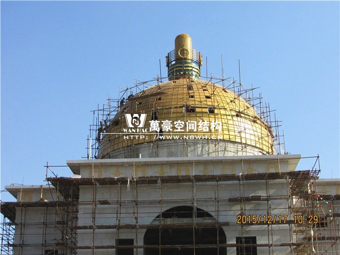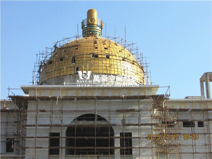 整個穹頂主結構由48根弧形鋼結構勾勒而成,外表面采用8000多塊金色鋁板拼裝完成,由于該項目為圓頂結構,每條緯線部分的每塊鋁板大小各異,因此對主結構加工、安裝精度要求極高,現場以一個平面控制網和48個徑向平面組成控制系統,即以平面代替三維空間,來達到精確、快速的測量定位及校正數據并順利完成施工。